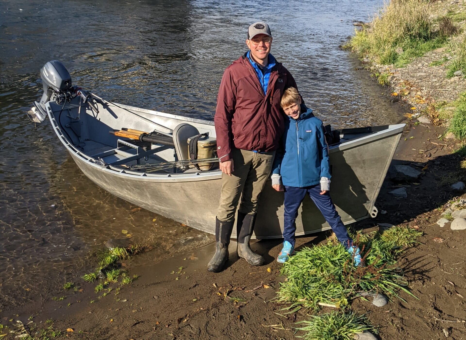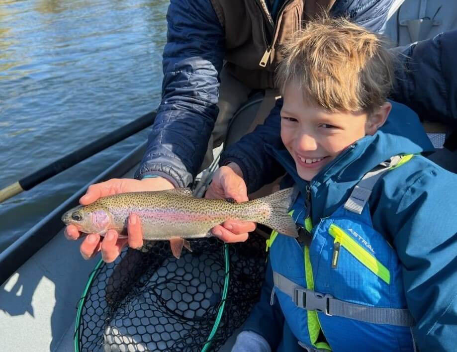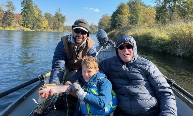 After a slow beginning landing smaller trout, things improved as we started hooking larger fish. Clay had a motor on this boat so we were able to return to productive drifts catching more than one large fish in several runs. It was fun to watch Weston cast the line where Clay instructed, manage the line as it floated over the drift and strike when we all yelled “set the hook”. He ended up fighting and landing 3 beautiful native rainbow trout in the 14 to16 inch range. All in all, we landed about 15 trout. It is safe to say that the strong fly fishing genes will continue to reside in the Pyrch family.