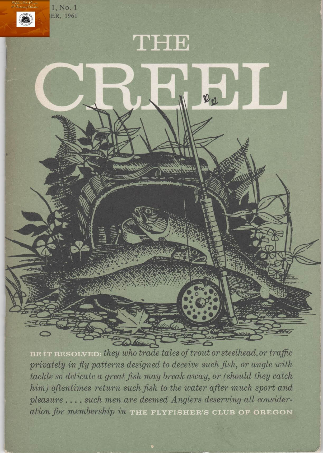 The Creel Committee members were Co-Editors Robert O. Beatty, Lenox Dick, Hidy, Fred Locke and Robert Wethern; the Art Director was Douglas Lynch; and printing was arranged by member and commercial printer Fred O. Hallwyler. Hidy was already an established angling writer, having produced The Art of Tying the Wet Fly with James Leisenring, and contributed articles to Sports Illustrated. Dick and Wethern went on to serve as Presidents of the FCO. Lynch was a well-known graphic designer who, among many other things, designed the Portland city flag, and the original FCO logo, as well as many illustrations in The Creel. An important non-member (initially) of the Club who contributed greatly to Club publications over many years was Tom McAllister, an outdoor writer for The Oregon Journal and The Oregonian newspapers, and who wrote the first article in Vol. 1, No. 1 of The Creel (Figure 2).