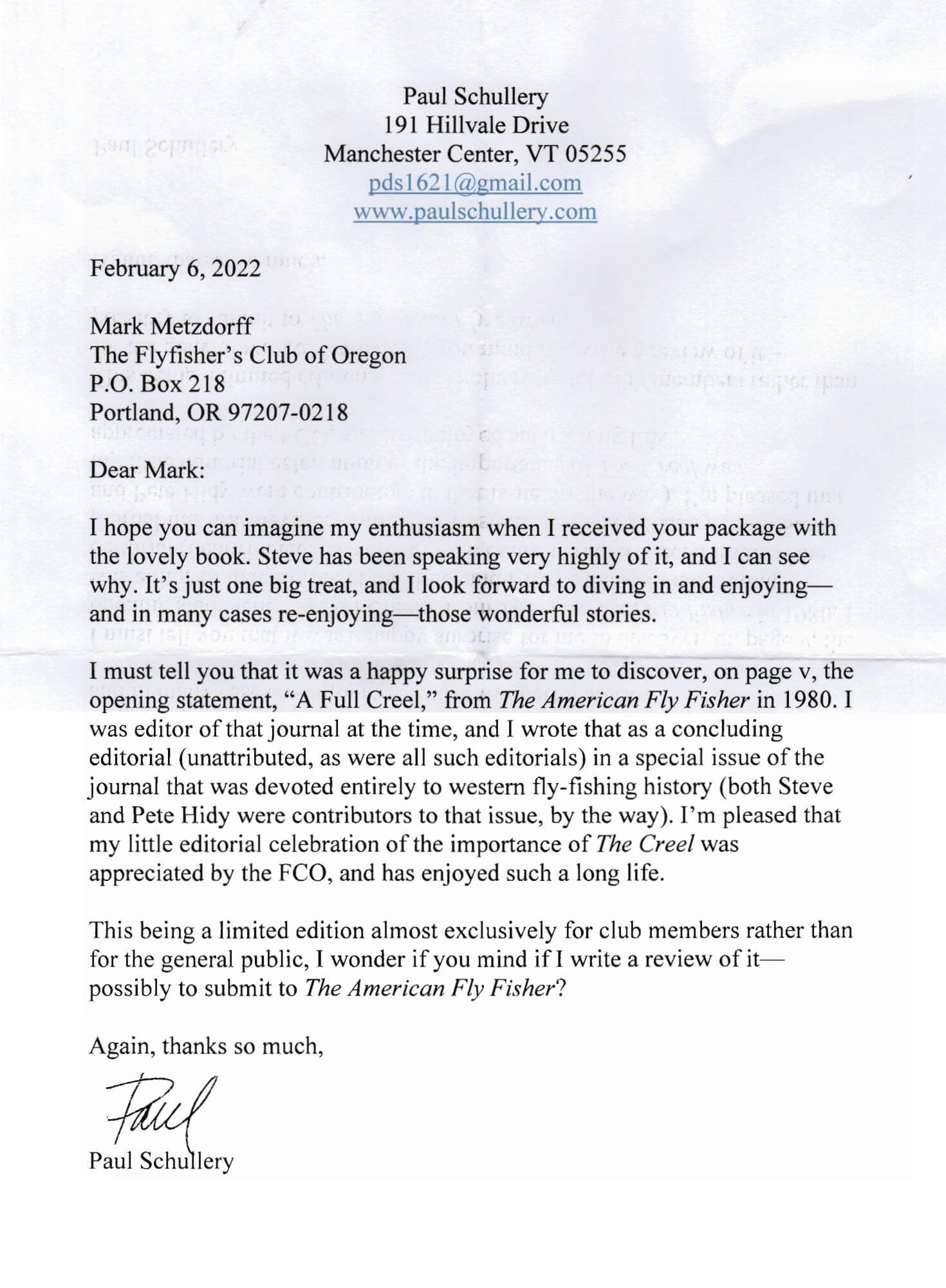 As previously mentioned, after its unveiling at the 60th Anniversary meeting in December, the latest Creel has been well-received by FCO members and others. Paul Schullery, noted author, former executive Director of the American Museum of Fly Fishing, and former editor of its journal The American Fly Fisher, sent a lovely note (Figure 1) after receiving his copy, which was sent on the recommendation of author and FCO friend Steve Raymond. I encouraged Paul to write a review for the AMFF journal, but to take it easy on we amateurs who are represented in the anthology.
