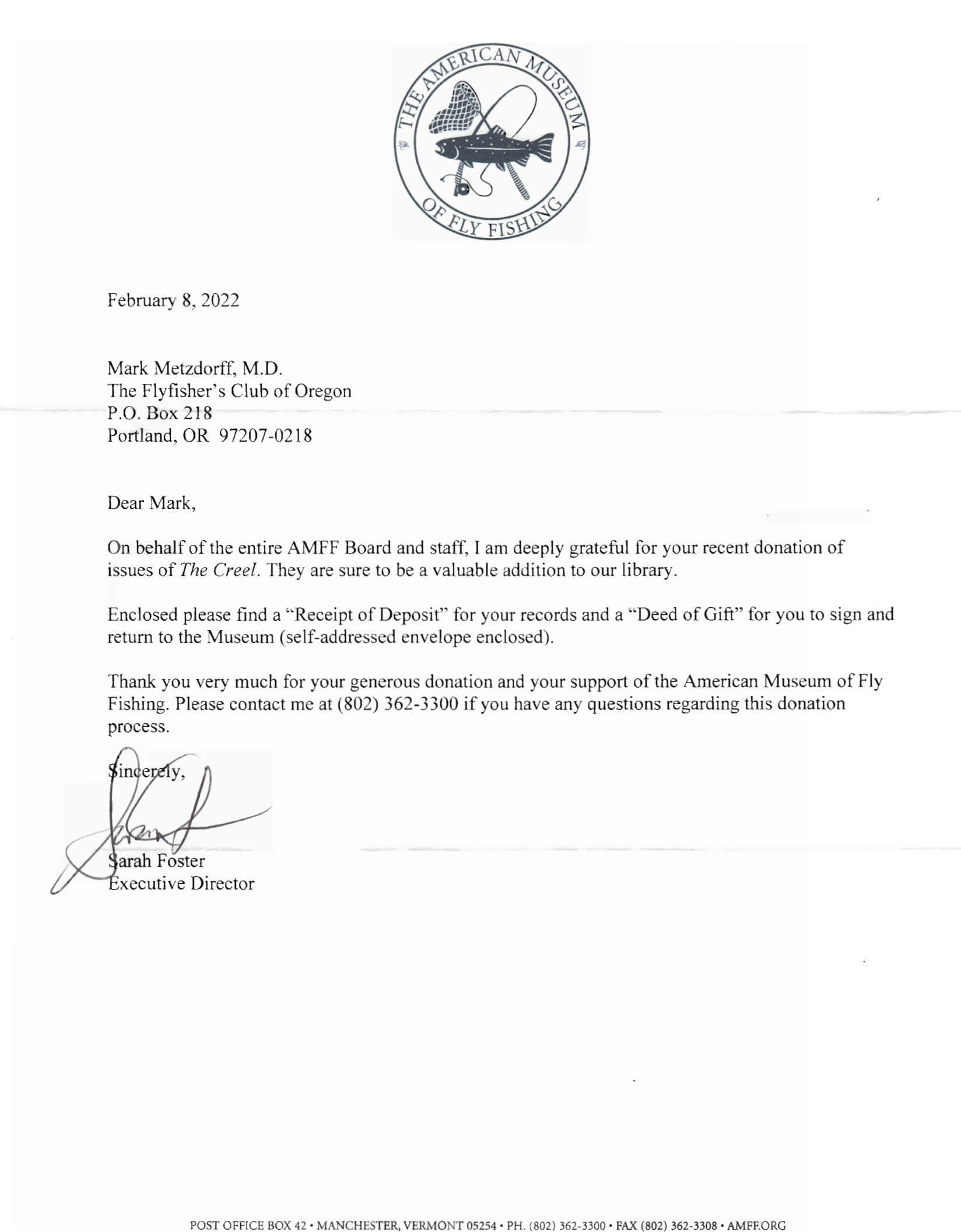 Figure 2. AMFF letter.A “complete” set of the original paper Creels was conveyed to them by the club in 1980, but two additional issues were published in 1982 and 1991. Bob Wethern had also sent them copies of his “Rivers of Oregon” series books (the McKenzie and North Umpqua Creels, published in association with the FCO’s 40th and 50th anniversaries, respectively). Now with the addition of the two missing paper Creels and the new book, their collection is up to date.