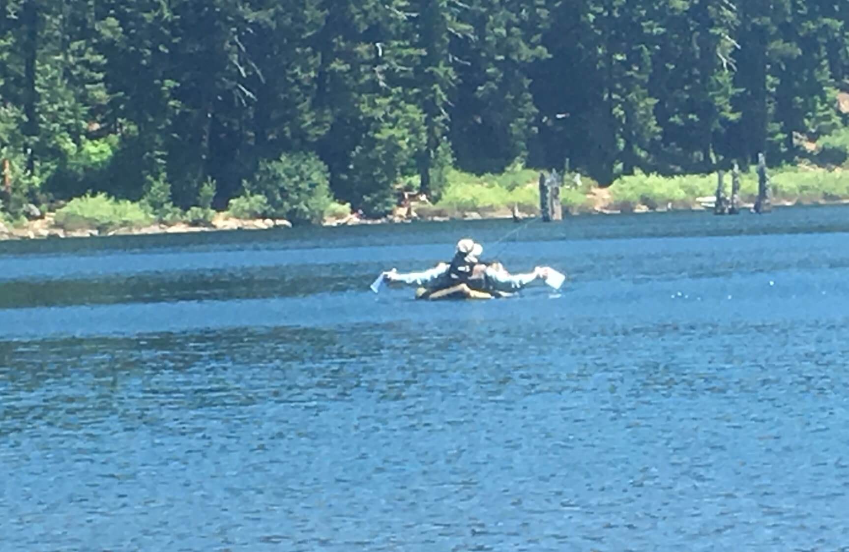 I had a situation develop last March while fishing Mullein Lake at the Rocky Ridge Ranch that raised this question. I was in my Fish Cat 4 float tube fishing the deep water by the dam. I was using a #6 weighted black leech with bar-bell eyes on a sinking tip line with a 4X tippet. I had just lost a nice trout that would have gone at least 5 pounds. It was difficult to fight a big, active fish while trying to get my long-handled net into a position to land it. After a couple of unsuccessful attempts the fly pulled out. Five casts later I hooked another huge trout. This time I was determined to get it in the net. After several strong runs, I worked the fish close to the float tube. But again I was having a hard time getting the monster trout in the net. Finally after stretching way out in front of me I got the fish in the net just as it had a final powerful surge that resulted in me slipping right off my slick seat into the water.  Fortunately, I was only about 10 yards from the shore and I was able to work my way to the bank. Even though I had my wader belt cinched up tight, my waders filled with water and my clothes were all wet. I found it very hard to move with the fins on my boots and my legs weighted down by the water in my waders. My fishing buddy was also in a float tube about 100 yards way. He could not move fast enough to be of any immediate help. A float tube is a slow and awkward rescue craft.