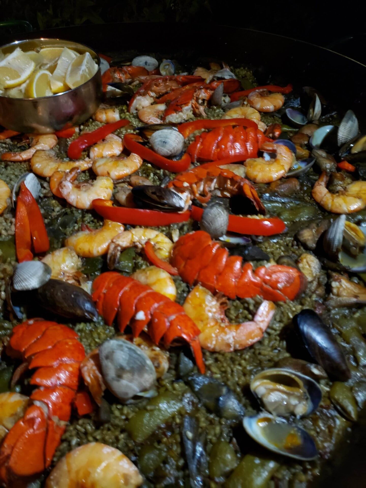 Janet Arenz and Curt Marr hosted, with appetizer platters, a brilliant seafood paella, a classic pomegranate molasses vinaigrette salad, a lemon sorbet with raspberries, and cookies of chocolate and ginger.