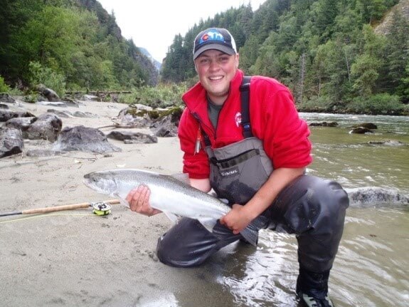 The story of that trip could be another essay; but suffice it to say that it allowed me to further Alex’s experience with the two-handed rod and its target species. His casting improved markedly, and it was on the Dean in July 2011 that he landed his first ever steelhead at age 19 (Figure 3). By that time I think he had lost track of the hours spent fishing for steelhead, but I’d wager it wasn’t too much more than 24 hours total, so perhaps he confirmed the conventional wisdom. Besides a couple other steelhead that week, he caught a large and enthusiastic chum salmon that had, in addition to Alex’s cone-head Intruder, two other steelhead flies in its jaw. Another lesson: angling always surprises, every day is different.